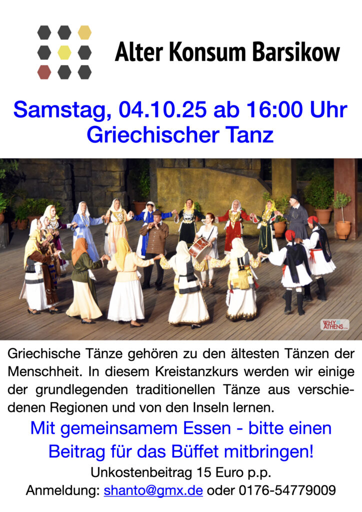 Was kommt? Samstag 04.10.2025 16:00 Uhr: Griechischer Tanz Das Jazzorchester "Prokopätz" aus Berlin (Foto: Herr Frehn) Im Sommerprogramm wird wieder einiges im Konsum Garten oder im Wäldchen stattfinden. Die Landschaft hinter dem Alten Konsum im frühen Frühling